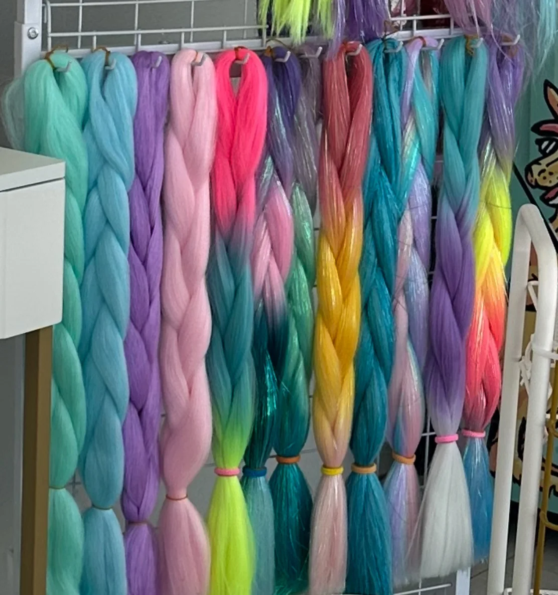 ผมถักเปียสังเคราะห์แบบจัมโบ้ ขนาด 24 นิ้ว น้ำหนัก 100 กรัม สีออมเบร เรืองแสงในที่มืด ผมนุ่มสำหรับต่อผม